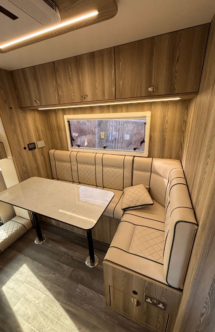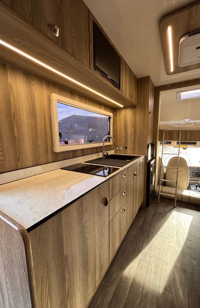This horsebox boasts a generous living area, thoughtfully equipped with everything you need for an extended journey.